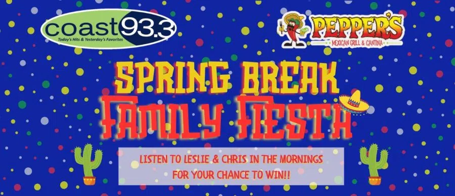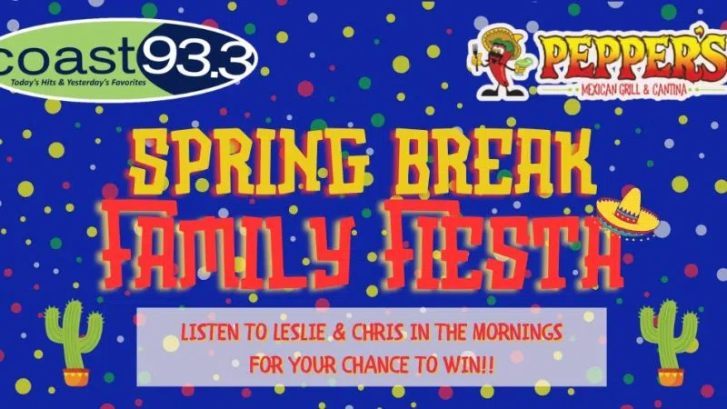 Coast 93.3 and Pepper's Mexican Grill & Cantina have put together something fun for kids this spring break week - It's a Spring Break Family Fiesta!!! Parents are always looking for something fun to do with the kids - and this is perfect! Good food. Good fun. At Pepper's! To win, listen to Leslie & Chris in ...
